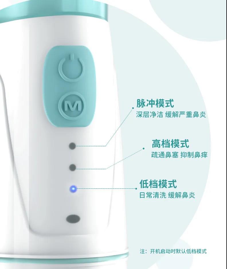 这款洗鼻器一共有低档、高档、脉冲三种模式,满足不同年龄段的宝宝,可以根据鼻腔状况随意调节到最舒适的档位。