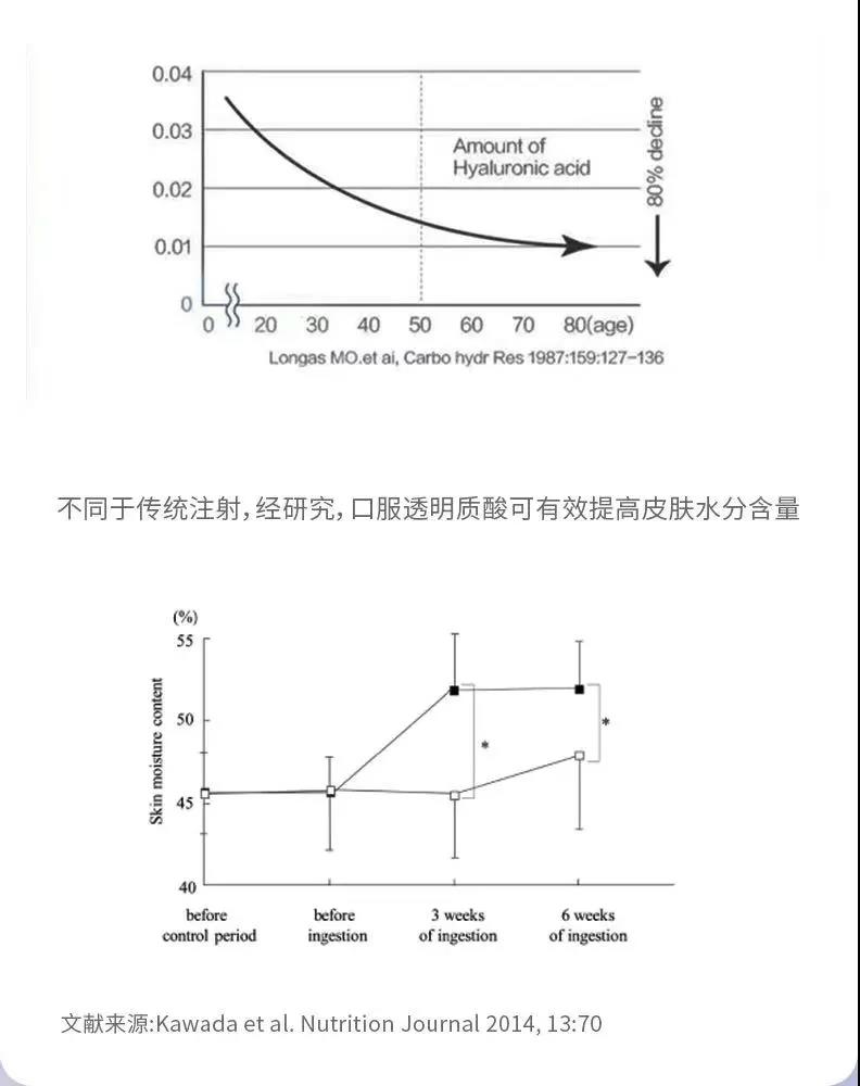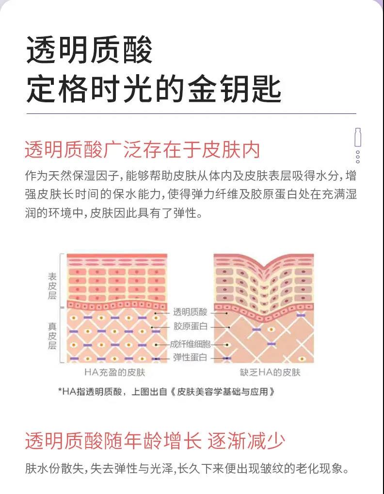 透明质酸钠在医美上会经常作为注射剂出现,因为细胞间的成分透明质酸钠的减少会导致皱纹形成,可以理解成细胞的支撑框架依然存在,但填充物却流失了,需要通过外部补充来重新还原细胞的饱满形态,外在表现为皮肤变得更滑润有光泽,柔嫩亮白。