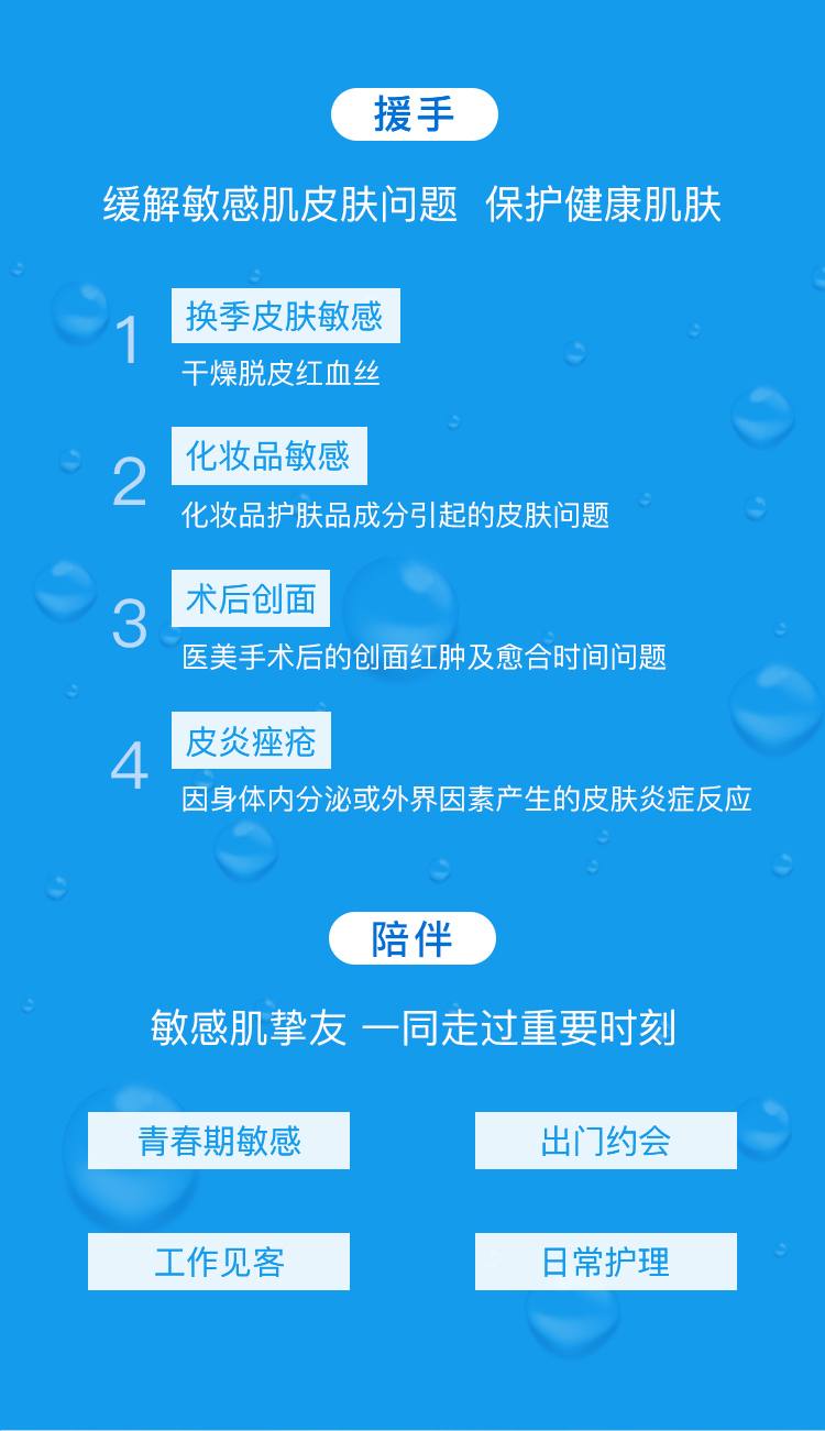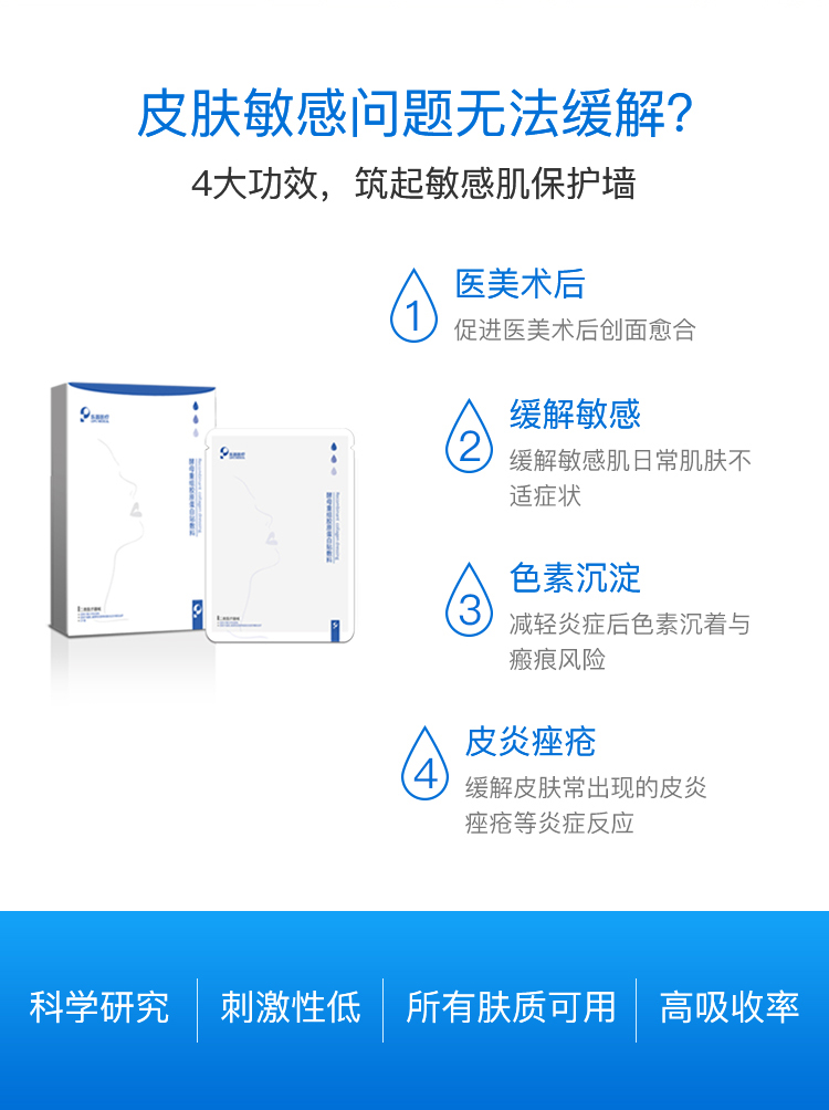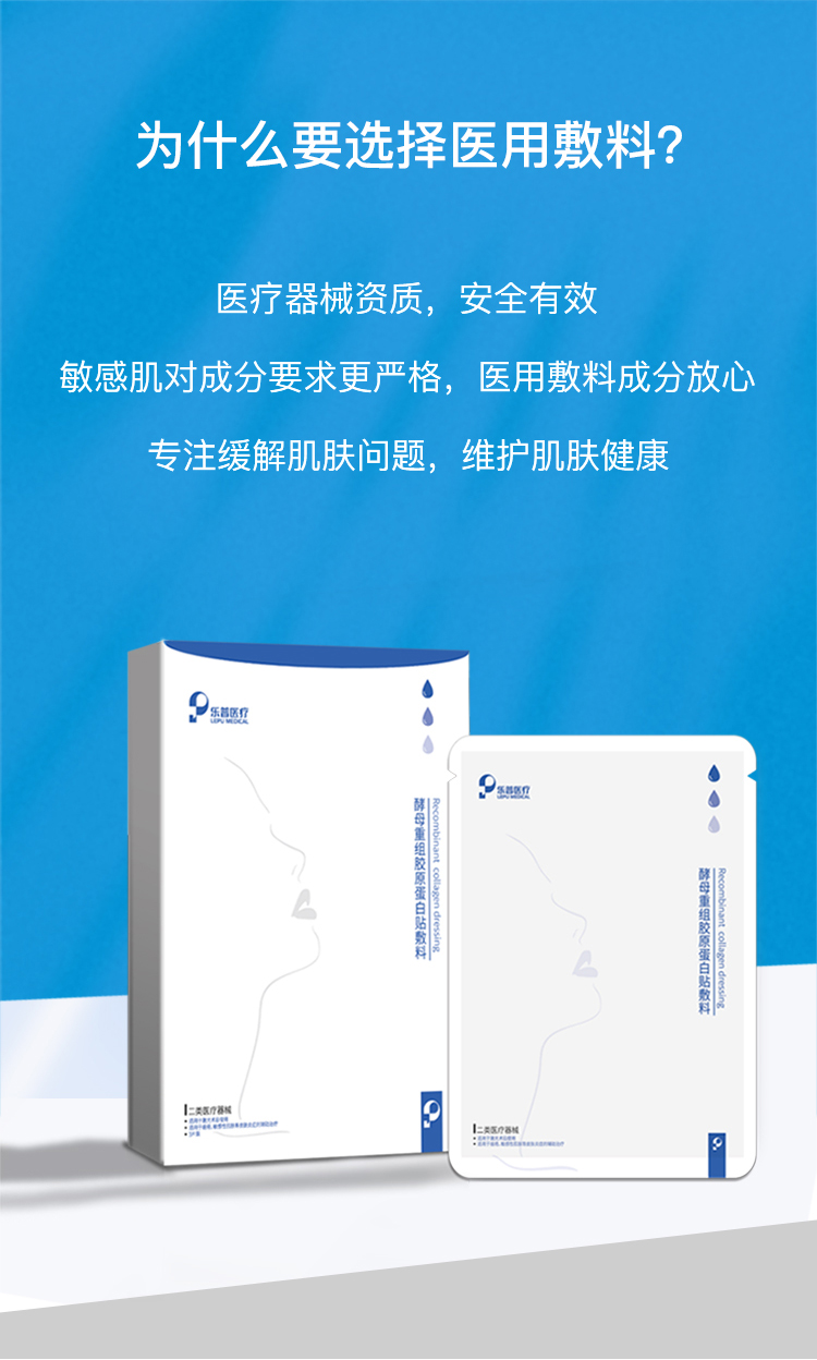 适用于敏感肌肤,补充胶原蛋白,抑制和缓解皮炎、痤疮、激光治疗后等引起的皮肤炎症反应,促进创面愈合与皮肤修复,减轻炎症后色素沉着与瘢痕形成的风险,具有医疗器械注册证,安全可靠。