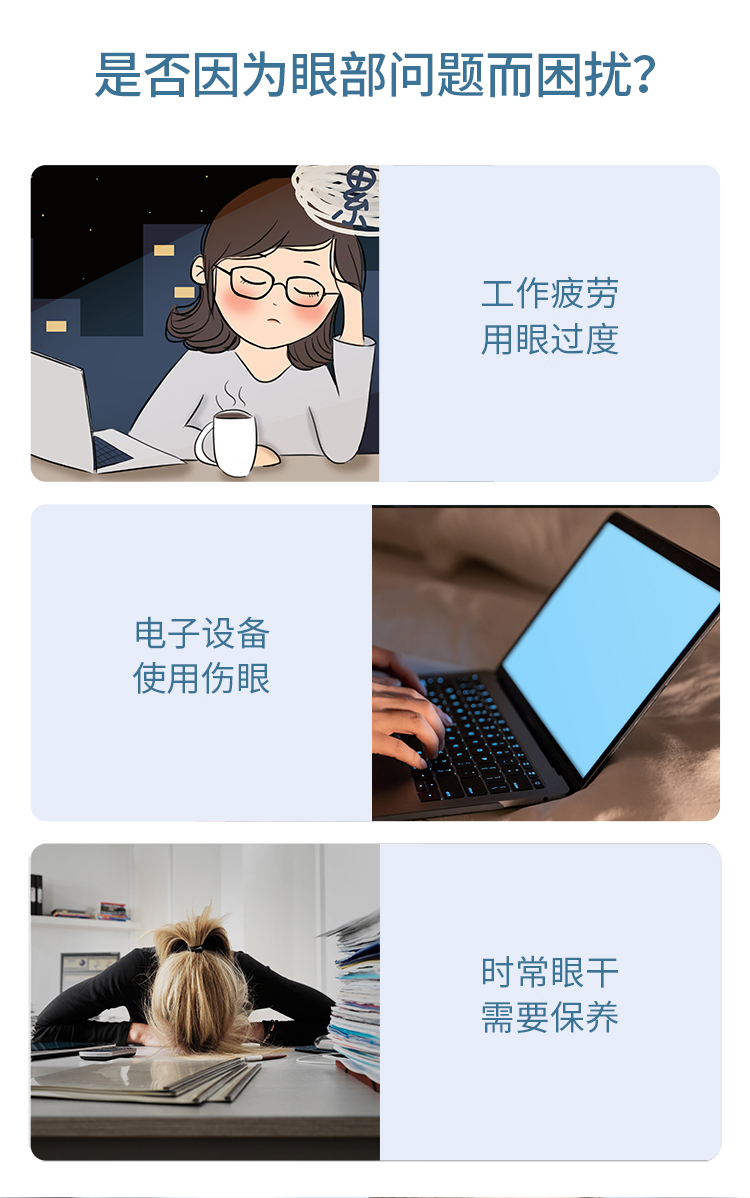 2.缓解眼部疲劳:因长期使用手机、电脑等引起的眼睛疲劳。同时可以为眼睛补水,预防和缓解眼干等眼部问题。