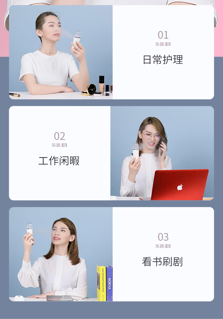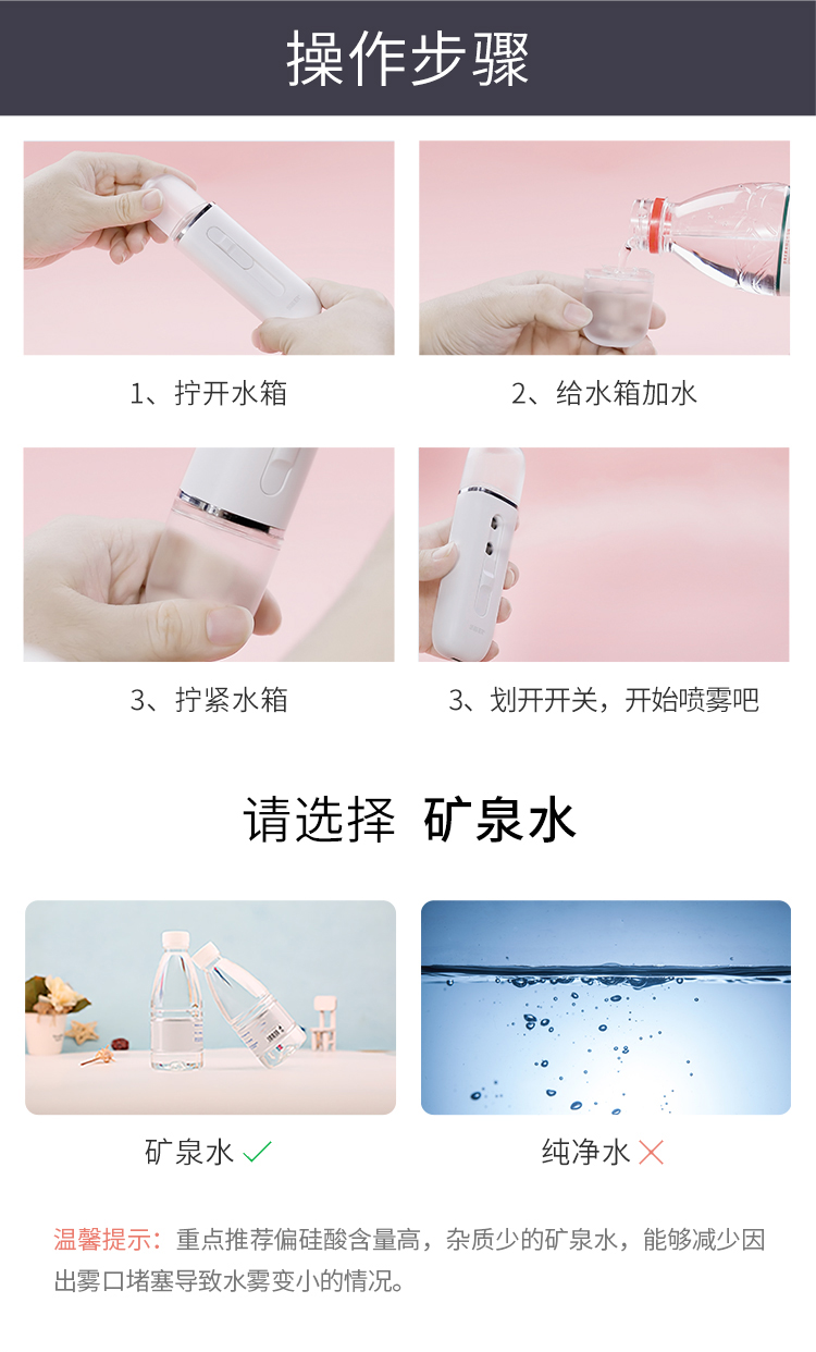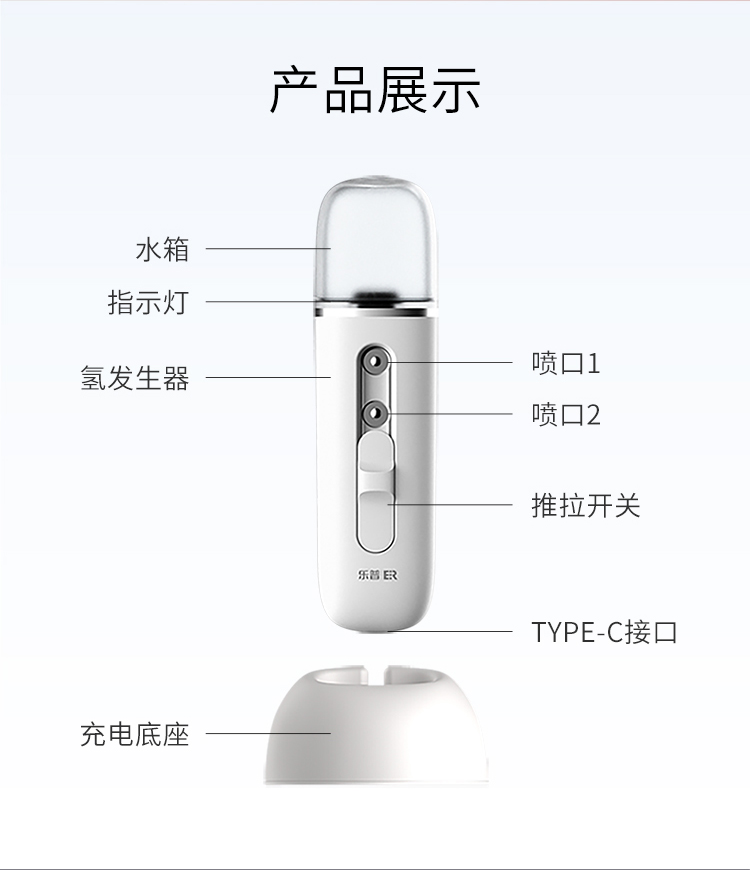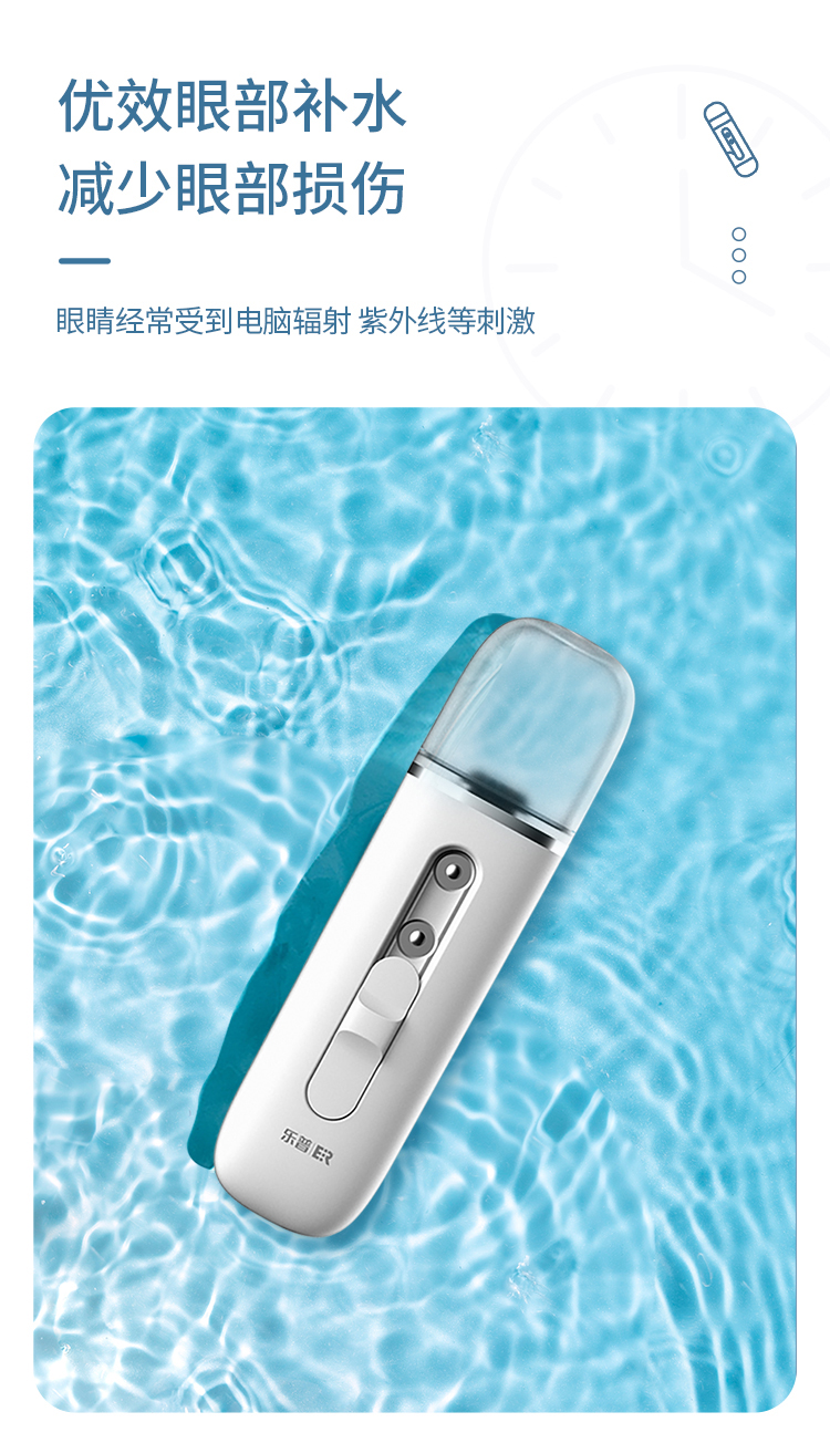 3.深层补水:产品应用陶瓷雾化片高频震荡,将水分子雾化成细的纳米颗粒,为肌肤深层补水。
